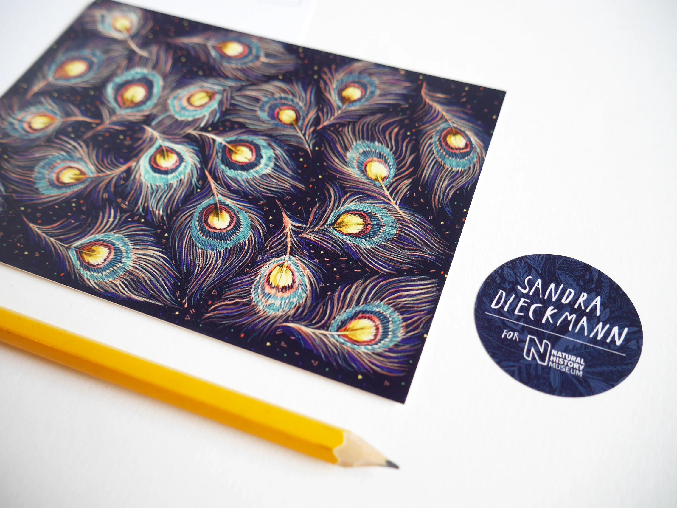 This is my 'Peacock Feathers' illustration which was launched at the Natural History Museum shop and their online store in August 2016 as greeting cards, postcards and wrapping paper in conjunction with their brand new Colour & Vision show and in collaboration with Etsy UK.